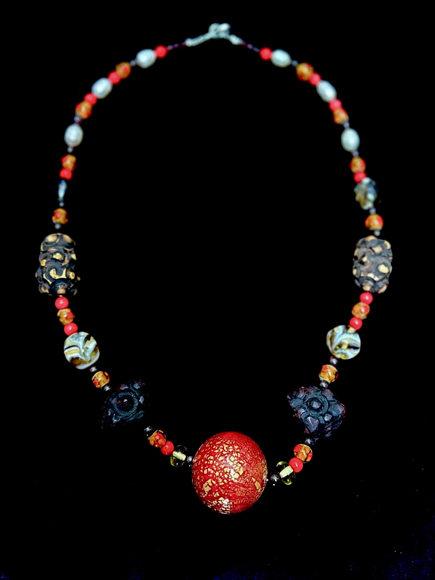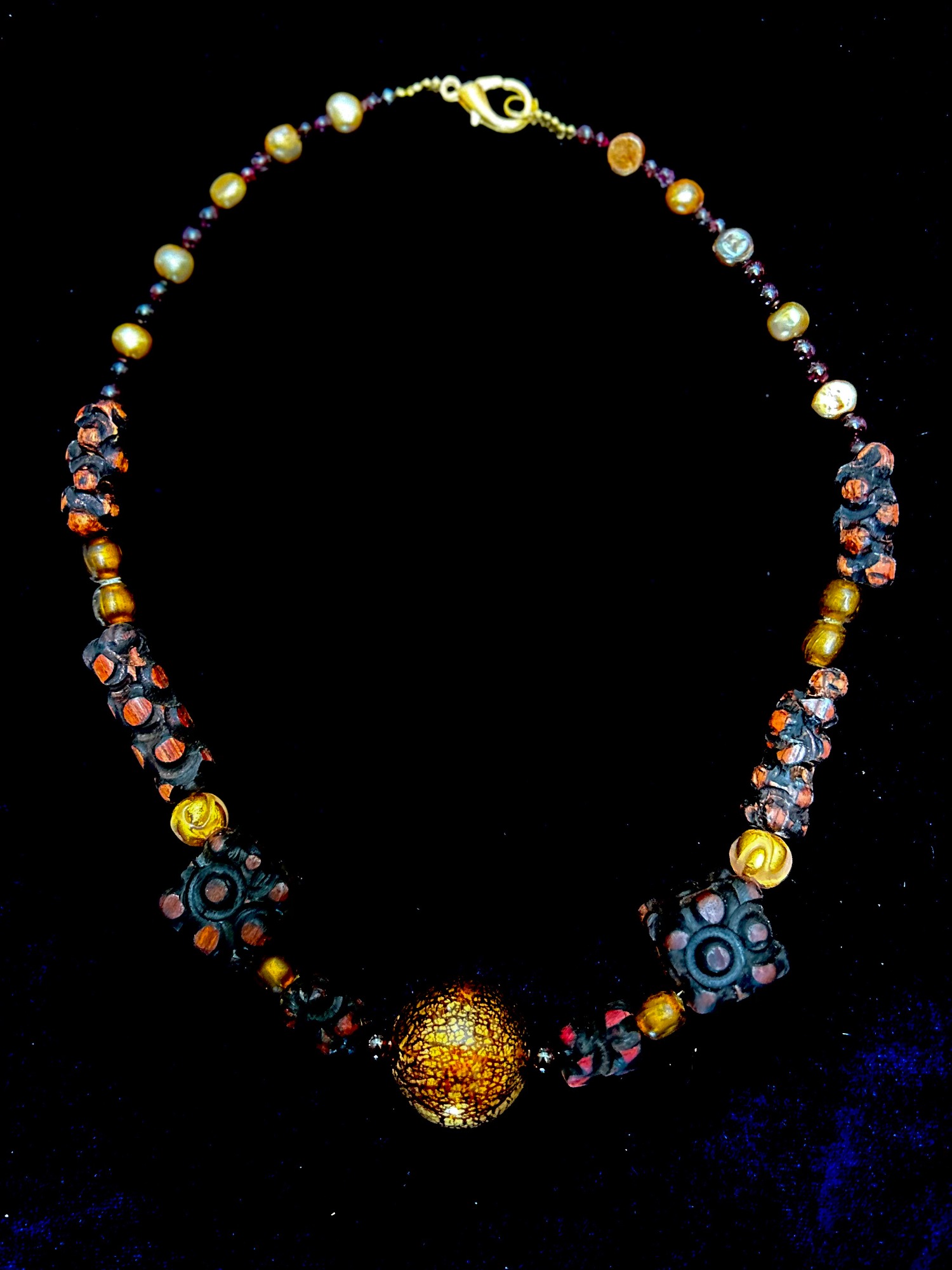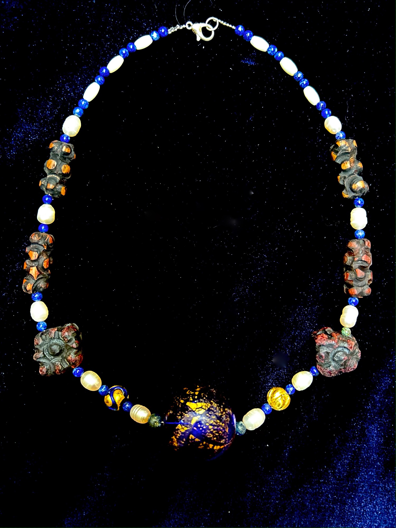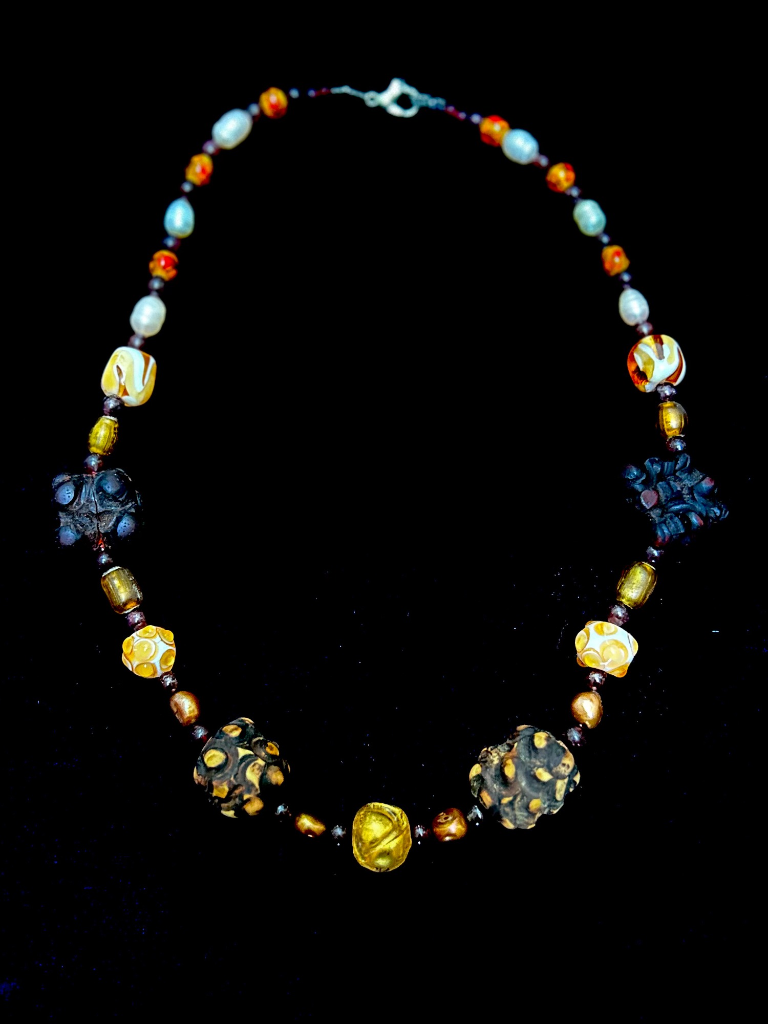 The blown and gilded glass Venetian beads were purchased from artist Lucio Bubacco in the 1980s. The multicolored glass Venetian beads are custom-made for the necklaces by Emanuela Chimonton in Venice. Emanuela is currently a Docent in Lucio Bubacco's Gallery.
