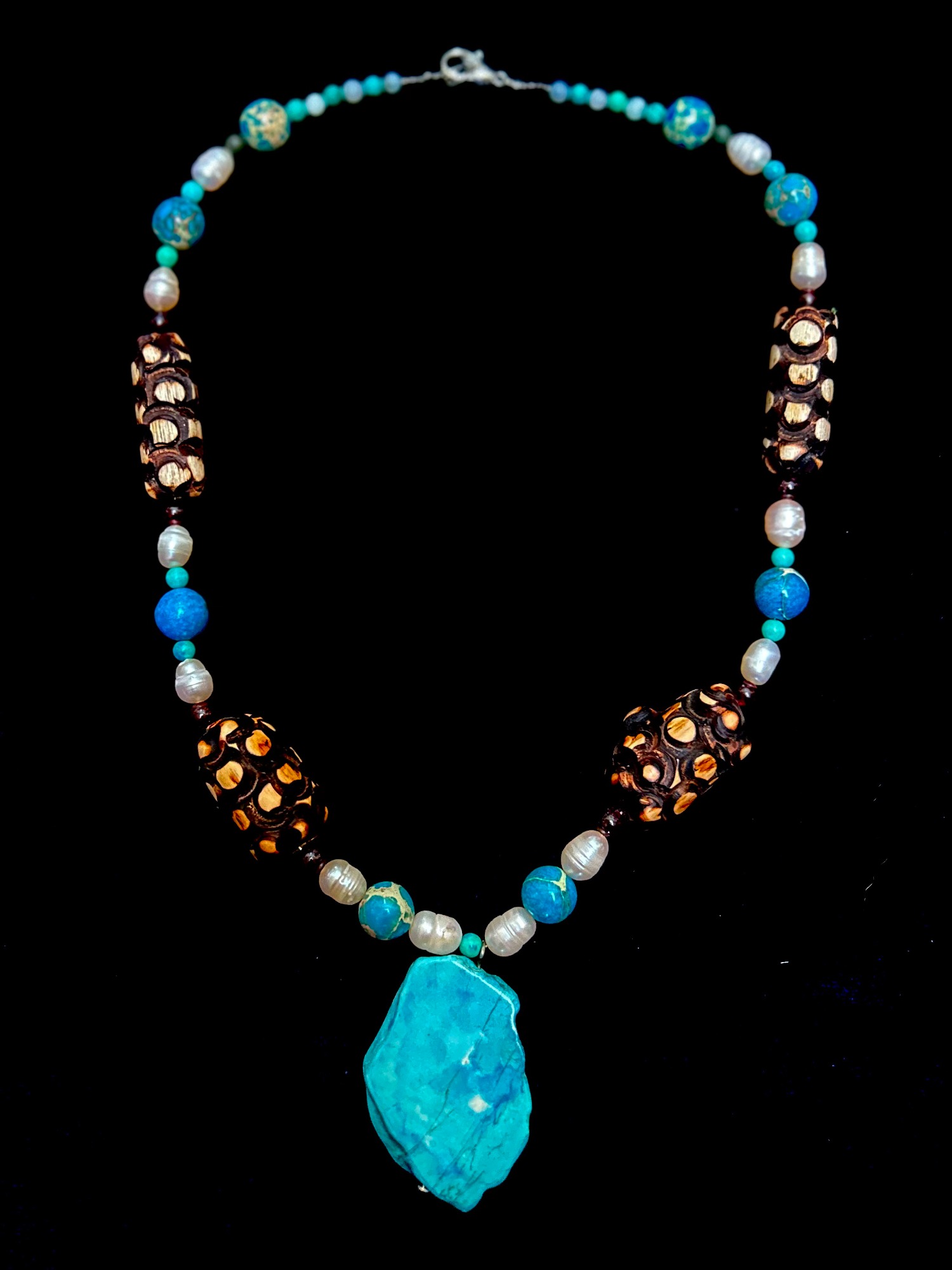 The wooden beads fare made from pruned fruit-tree branches and from fallen manzanita branches collected in nearby forests. These small branches are cut into short lengths and the pattern is burned into the wood, before polishing.